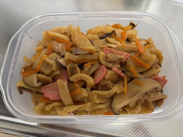 直ぐに、同じく戻していた干し椎茸、にんじん、油揚げ、なると共に煮物を作りました。